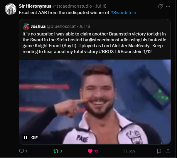 SwordStein was a perfect example of how Total Nonstop Braunstein is meant to work. I had fun as an outsider, but this game had real world effects on the ongoing campaign. A campaign world that many adventure parties play in weekly and the ramifications of the SwordStein events will immediately be felt when they return to the table.